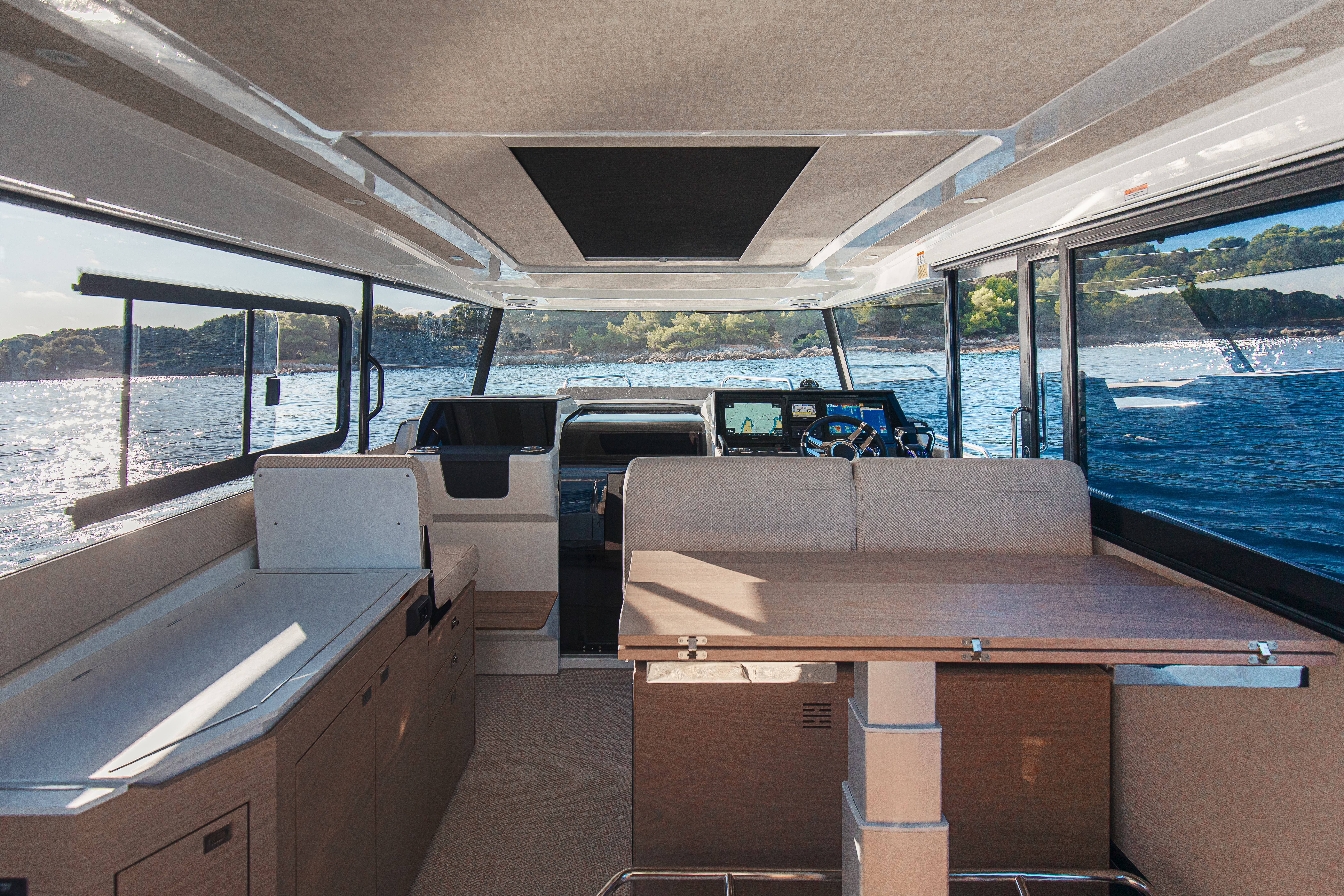 Inside, the cabin reads like Scandinavian architecture: bright, open, and purpose-driven, with glass and clean lines doing more than aesthetics—they shape a space that feels effortlessly usable. The result is a touring boat that’s engineered to keep you fresh, focused, and unhurried—no matter the latitude.